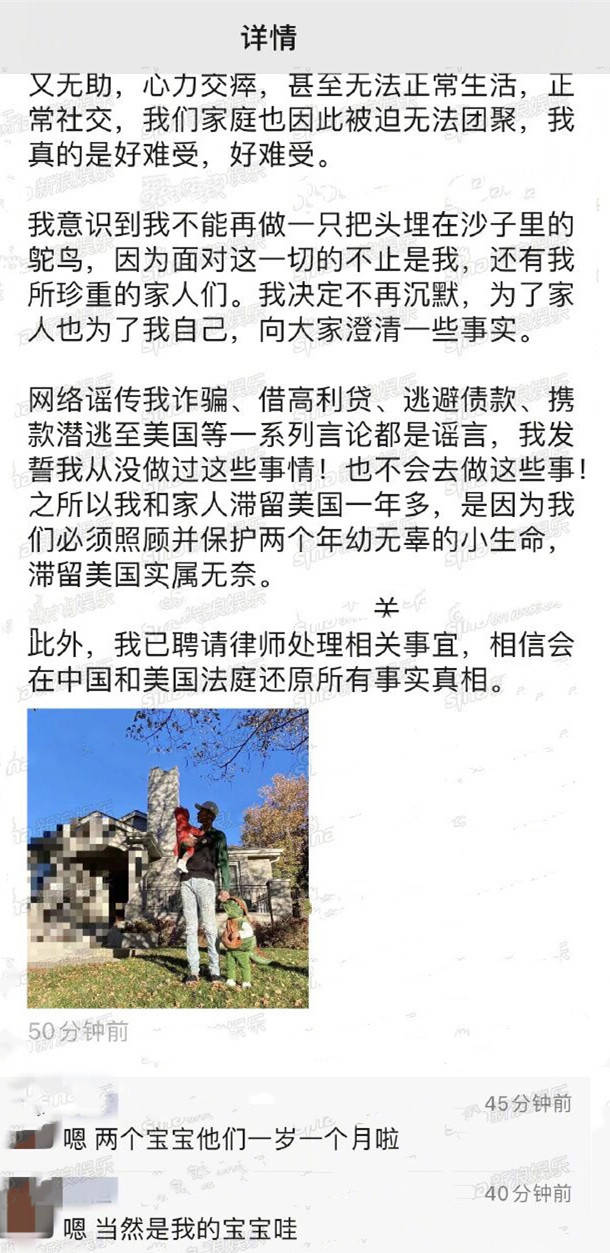 郑爽的前男友张恒在微博发长文回应了自己近一年来在网上遭受到的攻击和抹黑,他先是否认了自己有关诈骗、借高利贷、逃避债款、携款潜逃至美国等一系列言论,不过他承认了自己在美国的事实,而令人意外的是他滞留在美国的原因是他说“必须照顾并保护两个年幼无辜的小生命”